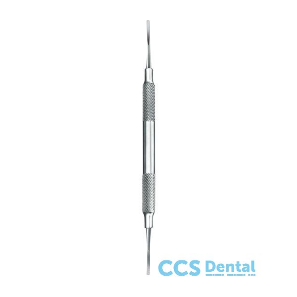 Periostótomo. La forma esbelta permite un apartamiento particularmente preservador y atraumático de la encía y del colgajo mucoperióstico.