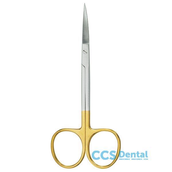Tijeras para encía.En las tijeras de corte se han añadido unas placas especiales de carburotungsteno para aumentar de forma considerable la capacidad de corte. Además. gracias a los elementos de CT aumenta significativamente la resistencia frente a las influencias térmicas de la termodesinfección (93ºC) y la esterilización (hasta 180°C). El mango está dorado por los dos lados.12cm. curva.